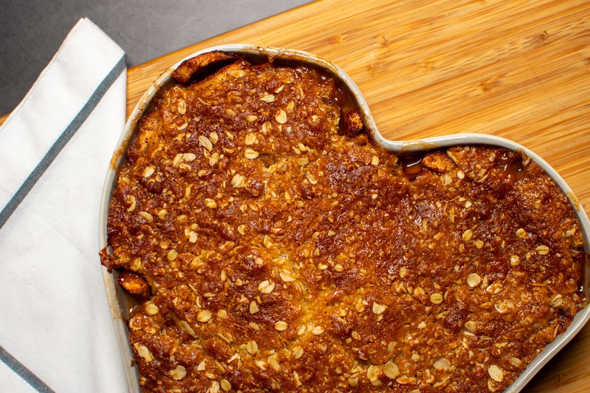- Lägg äppelbitarna i en pajform och strö över kanel och socker.