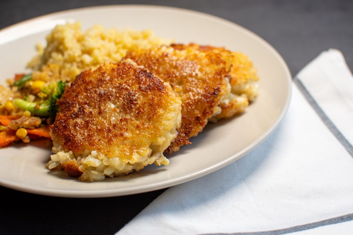 Ta en stor sked risotto och forma genom att trycka ihop med handen en platt och rund form.